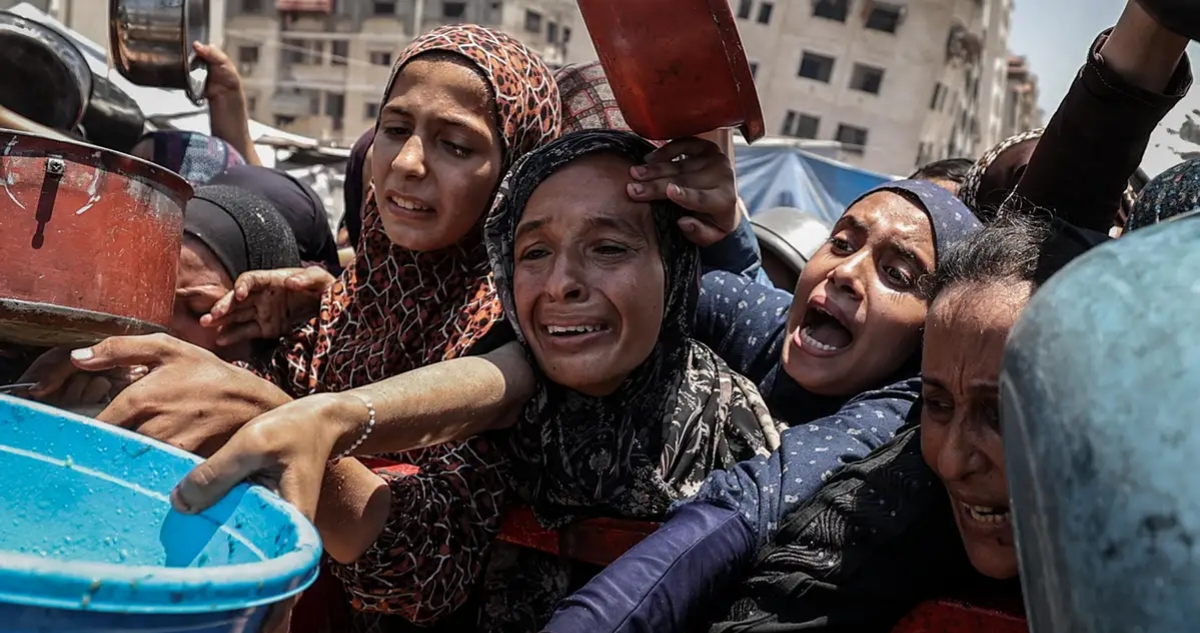 La imagen en cuestión, fechada el 24 de julio, fue tomada en Gaza y muestra a personas esperando con ollas vacías antes de la distribución de alimentos en el comedor social, lo que coincide con momentos previos a la distribución vistos en otras imágenes.