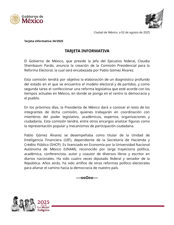Ciudad de México.- El Gobierno de México, encabezado por la Presidenta Claudia Sheinbaum Pardo, anunció este sábado la creación de la Comisión Presidencial para la Reforma Electoral, que estará dirigida por el economista Pablo Gómez Álvarez.