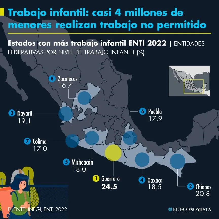 Cerca de 3.7 millones de menores de edad que habitan en México realizan algún trabajo no permitido. La cifra representa un aumento de 14% desde 2019, el año previo a la pandemia de Covid-19. El estado con la mayor cantidad de menores que trabajan, es Guerrero.