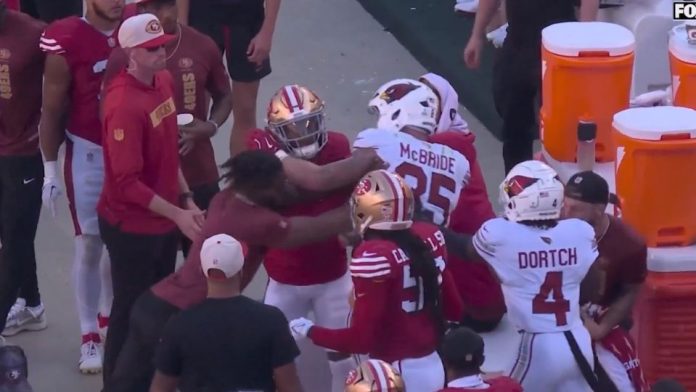 Durante la jugada en el tercer cuerto del partido, Charvarius Ward, esquinero de los 49ers, forcejeó con McBride después de que este lo bloqueó en el área del banco de San Francisco. En un intento por proteger a su compañero, Greenlaw, quien está en la lista de jugadores incapaces de participar en el partido por lesión, intervino empujando a McBride.