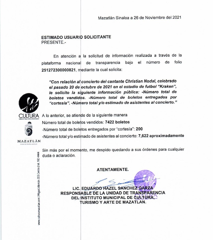 El Ayuntamiento de Mazatlán erogó 2 millones 781 mil 808 pesos en la realización del concierto de Christian Nodal el 20 de octubre en el estadio “El Kraken”, pero apenas se recaudaron 2 millones 226 mil 600 pesos, de acuerdo con una solicitud de información requerida al Instituto Municipal de Cultura y Arte de Mazatlán.
