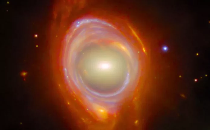 En el centro de la imagen se encuentra la galaxia más cercana, que actúa como una lente gravitacional. Detrás de ella, mucho más lejos, está otra galaxia cuya luz ha sido distorsionada y parece envolver a la primera, formando un círculo de luz casi perfecto.