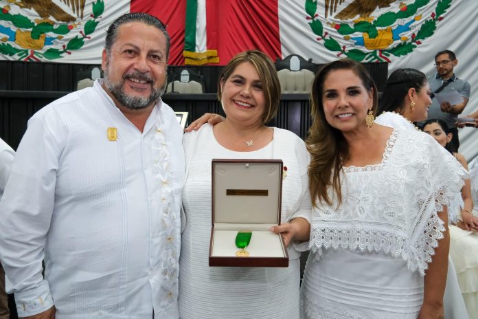 Chetumal.- En sesión solemne del Congreso del Estado, la gobernadora Mara Lezama Espinosa entregó la Medalla al Mérito Quintanarroense “María Cristina Sangri Aguilar”, a la ciudadana Yusi Evelyn Dzib Echevarría por su aportación a través de la Fundación Aitana, un faro de esperanza para cientos de niñas y niños que sufren el flagelo del cáncer.