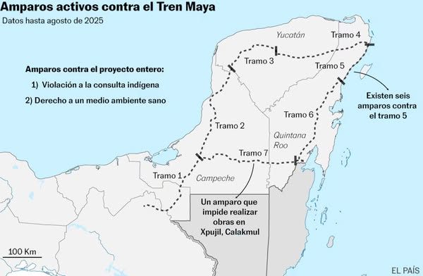EL PAÍS habló con demandantes y abogados de ocho de los al menos nueve amparos que siguen activos contra el Tren Maya, el megaproyecto mimado del sexenio de Andrés Manuel López Obrador. Con 1.544 kilómetros, el recorrido parte de Palenque (Chiapas) y traza un lazo por la Península de Yucatán. Durante su construcción, además de saltarse las leyes ambientales, hubo conflictos sociales, problemas de contaminación—deforestación, daños a sistemas de cuevas y cenotes, la alteración de ecosistemas— y sobrecostes. Con un presupuesto programado de 150.000 millones de pesos, al final de 2024 llevaban gastados casi 500.000 millones de pesos.