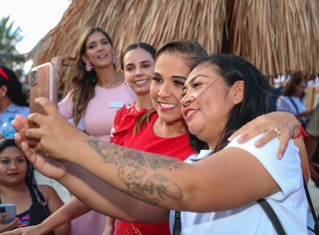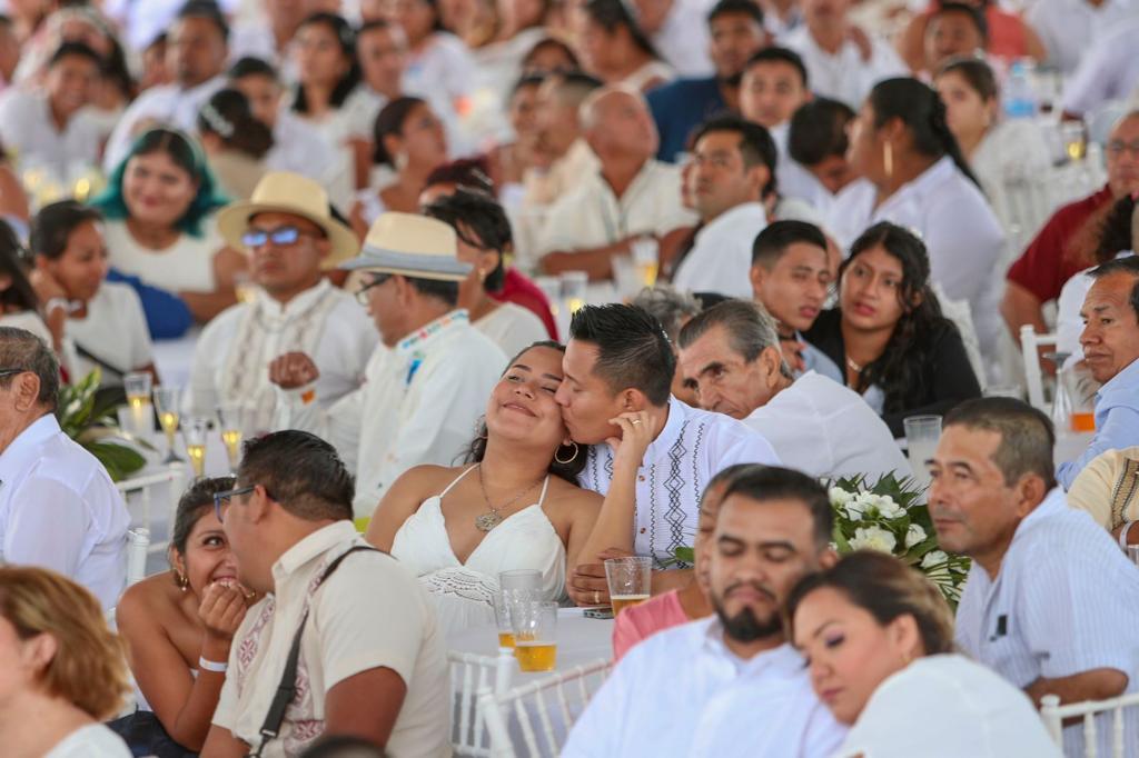 Cancún.- La gobernadora, Mara Lezama Espinosa, fue testigo de la unión legal de 402 parejas en Benito Juárez, que celebraron en Playa Marlín junto a sus familias, con quienes compartió su alegría y satisfacción de constatar cómo las parejas hacen equipo para caminar de la mano, para que en caso de ser necesario uno jale al otro y nadie se quede atrás.