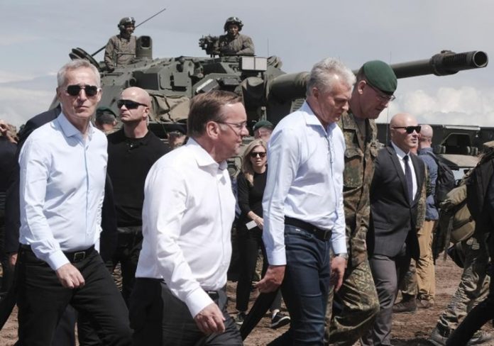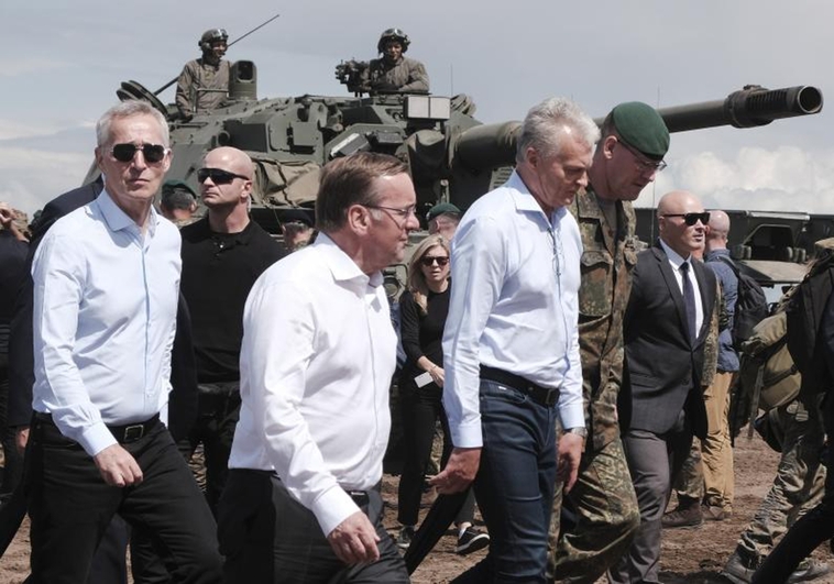 Pabrade (Lithuania), 26/06/2023.- (L-R) NATO Secretary General Jens Stoltenberg, German Defence Minister Boris Pistorius and Lithuanian President Gitanas Nauseda visit the training phase of Exercise Griffin Storm at the General Silvestras Zukauskas Training Area, in Pabrade, Lithuania, 26 June 2023. NATO Secretary General Jens Stoltenberg traveled to Lithuania between 26-27 June, as part of preparations for a NATO Summit taking place in Vilnius next month. On this occasion Stoltenberg, joined by Lithuanian President Gitanas Nauseda and German Defence Minister Boris Pistorius, met German and Lithuanian troops training together in Exercise Griffin Storm 2023 at the General Silvestras Zukauskas Training Area in Pabrade. (Alemania, Lituania) EFE/EPA/VALDA KALNINA