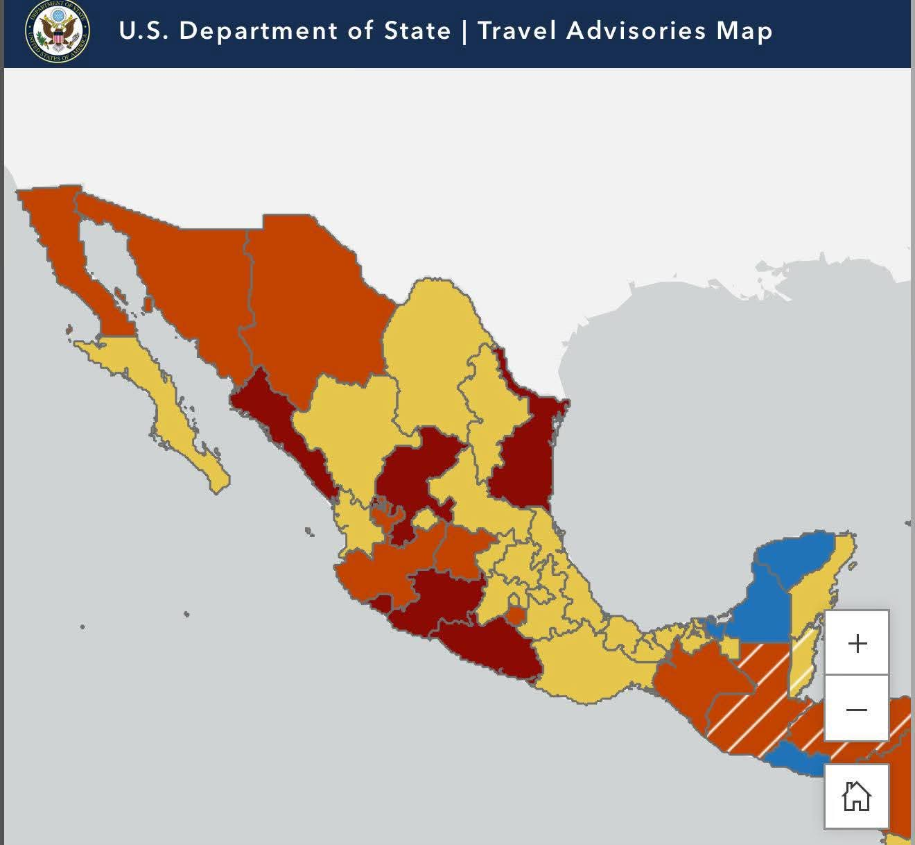 Ciudad de México.- El Departamento de Estado de Estados Unidos actualizó su mapa de alerta de viaje para México, colocando a Quintana Roo en nivel amarillo, lo que significa que sus ciudadanos deben “reconsiderar el viaje” debido a zonas con alto riesgo.