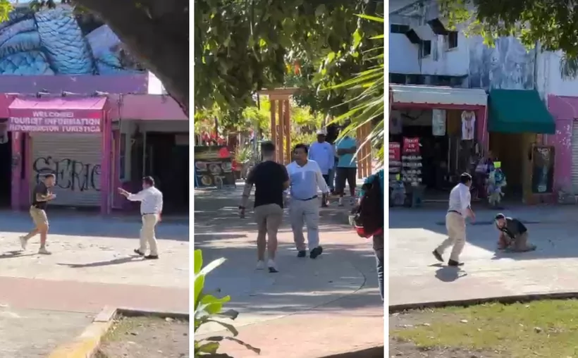 En la grabación, de la cual se desconoce la fecha exacta, se observa a un hombre con playera negra y bermuda caqui persiguiendo a otro sujeto vestido con camisa azul y pantalón crema. El supuesto vendedor, al verse acorralado, le advierte al turista con un “don’t touch me”, pero también responde con empujones y golpes, desatando un breve enfrentamiento físico.