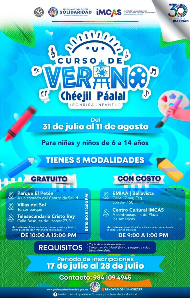 Playa del Carmen, Solidaridad.- Con el fin de acercar e interesar a la niñez en las bellas artes, a través del Instituto Municipal de la Cultura y las Artes, (IMCAS) la presidenta Lili Campos invita a participar en el curso de verano Chéejil Páalal (Sonrisa Infantil) del 31 de julio al 11 de agosto y dirigido a niños de 6 a 14 años.