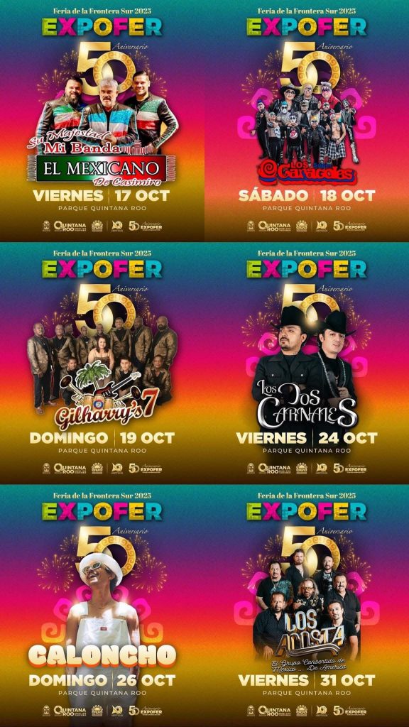 “Amigas y amigos, les comparto la cartelera oficial de la Expofer 2025. Del 17 de octubre al 1 de noviembre, el Parque Quintana Roo será sede de esta tradición que celebra medio siglo de historia en Chetumal. Vayan con toda la familia y disfruten momentos llenos de música y diversión”, expresó la gobernadora durante la presentación.