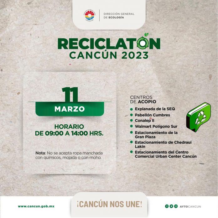 Cancún, Q. Roo.- A través de la Dirección General de Ecología, el gobierno de Benito Juárez, invita a la ciudadanía este próximo sábado 11 de marzo, a participar en la quinta jornada de “Reciclatón 2023”, con la finalidad de continuar impulsando la cultura del cuidado del medio ambiente e intentar superar los 22 mil 059 kilos de materiales reciclables recaudados en la anterior edición.
