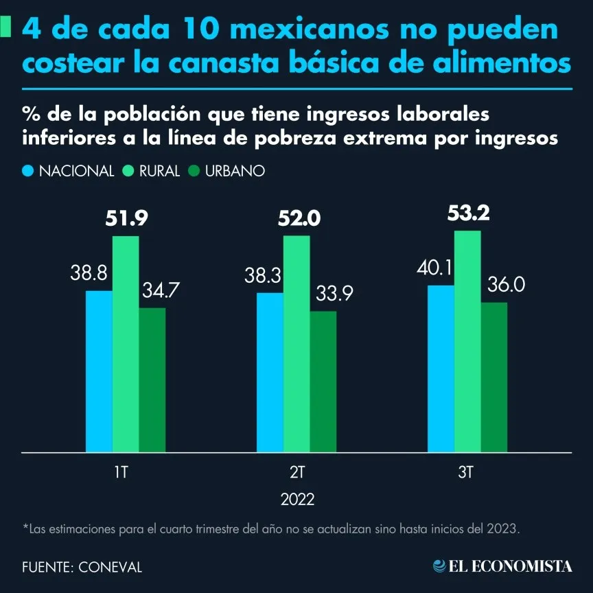 A la par de la tendencia de inflación acelerada, en México, 4 de cada 10 personas no pueden costear su alimentación con su ingreso laboral, de acuerdo con estimaciones del Coneval (Consejo Nacional de Evaluación de la Política de Desarrollo Social).
