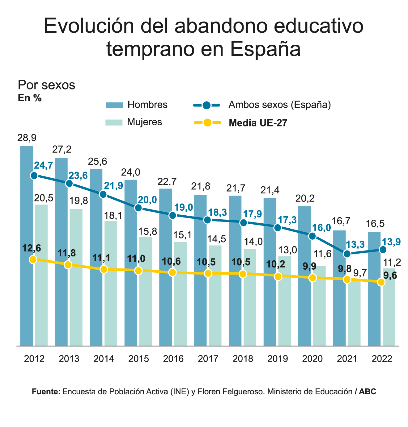 El docente, sin embargo, también alerta ahora de la tasa de abandono de 2023. Si bien solo se conocen los datos preliminares el panorama podría ser igual de malo que en 2022. Así, la tasa de abandono educativo temprano en el primer trimestre de 2023 en España fue del 13,0% (en comparación con el 13,5% del primer trimestre de 2022) y del 13,7 % en el segundo trimestre (superior al 12,8 % del segundo trimestre de 2022). «En el primer trimestre de 2023 el dato fue mejor que en el primer trimestre del año anterior pero el dato del segundo trimestre de 2023 ha sido peor que el de 2022. En definitiva, en lo que va de año, la tasa de abandono en 2023 es muy similar a los dos primeros de 2022. Esperábamos que el dato de 2023 fuera mejor que el de 2022 y se acercara incluso al de 2021 pero de momento esto no está ocurriendo», advierte Sanz.