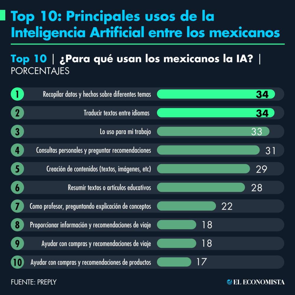De acuerdo con cifras de una encuesta realizada por la plataforma Preply, el principal uso que le dan a estas herramientas los mexicanos es la recopilación de datos e información sobre distintos temas; cerca del 34% aseguran que utilizan IA para estas tareas.