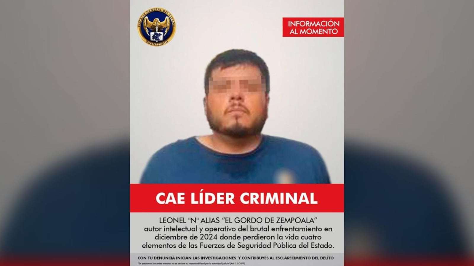 De acuerdo con la Fiscalía, “se ha podido establecer que este peligroso sujeto fue el autor intelectual y operativo del brutal enfrentamiento en el que en diciembre de 2024 perdieron la vida cuatro elementos de las Fuerzas de Seguridad Pública del Estado, en Uriangato”.
