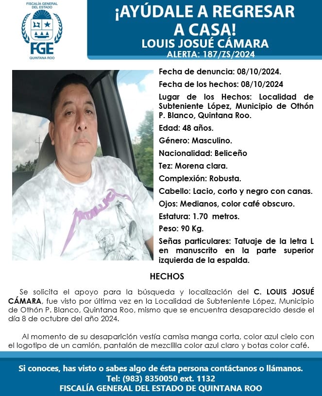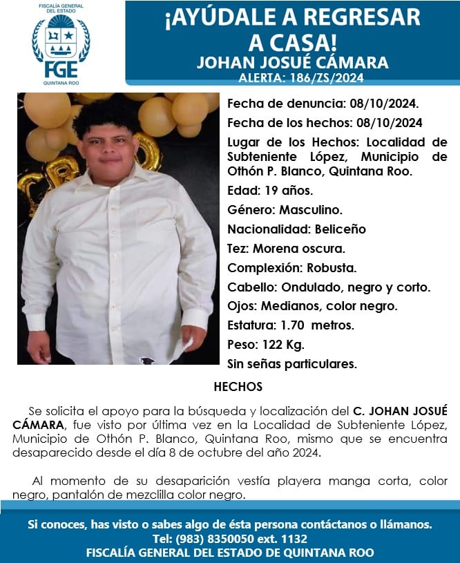 La Fiscalía General de Quintana Roo ya emitió la ficha de desaparición y búsqueda de ambas personas; Johan Josué Cámara y su padre Louis Josué Cámara, quienes al parecer fueron secuestrados por un grupo de hombres fuertemente armados.
