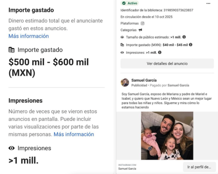 La pareja gastó en promedio 111 mil pesos al día en esta publicidad en las redes de Meta. Hubo un pago de 600 mil pesos para promocionar un sólo posteo en Instagram, de su vida familiar. En otros se destacan acciones de la administración de Samuel García al llegar a su Cuarto Informe de Gobierno.