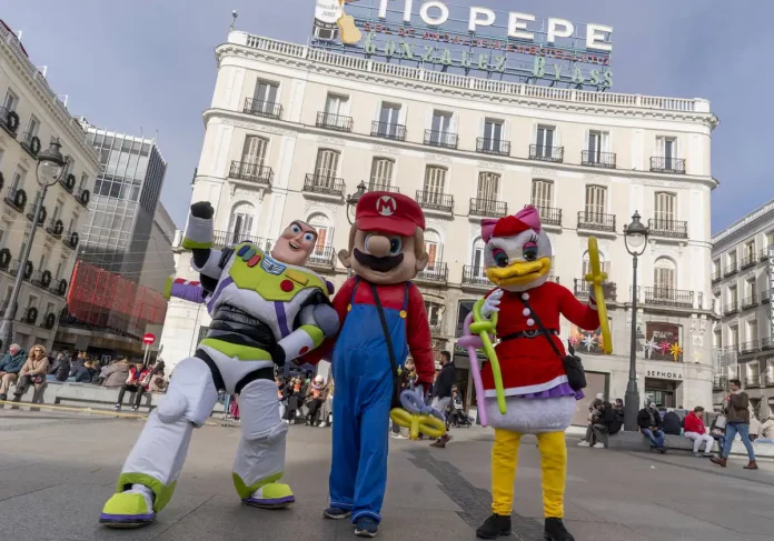 Los dibujos animados de la Puerta del Sol son anárquicos y se mueven deprisa. Hay un par de Marios Bros y de Mickeys Mouse que intentan no coincidir para que el niño no se crea que está viendo doble y cuesta convencer a más de tres figurantes para que posen en una foto grupal para el periódico. Se dispersan en cuanto detectan la presencia de una madre con carrito.