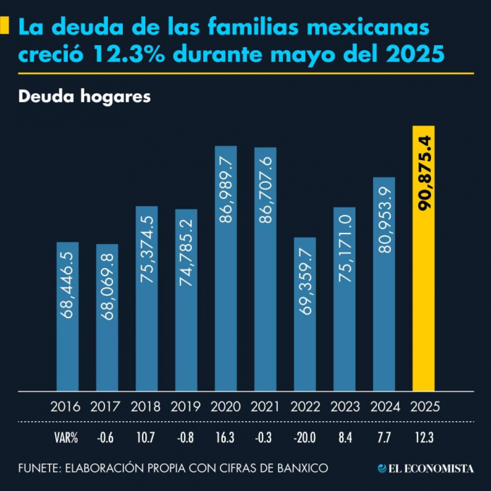 La deuda de los hogares mexicanos ascendió a 90,875 millones de pesos durante mayo del 2025, el máximo registrado para un quinto mes desde tiempos de pandemia, cuando la crisis económica llevó a las familias a endeudarse para enfrentar gastos.