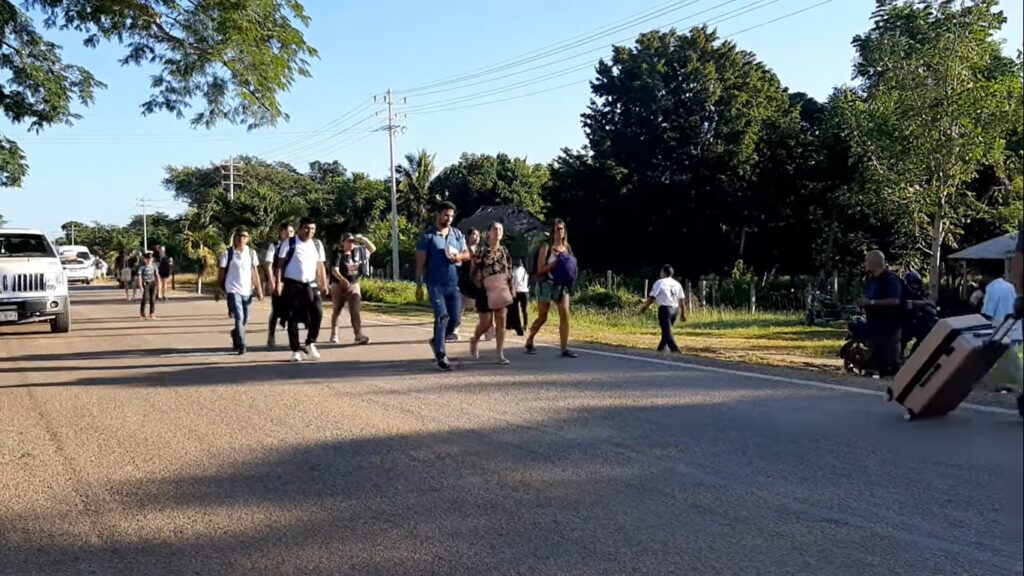 Decenas de turistas del lado de Chiquila bajan para abordar las unidades que los esperan del otro lado ante el bloqueo de los ejidatarios de Kantunilkín que piden indemnización a la CFE por ocupación de sus tierras.