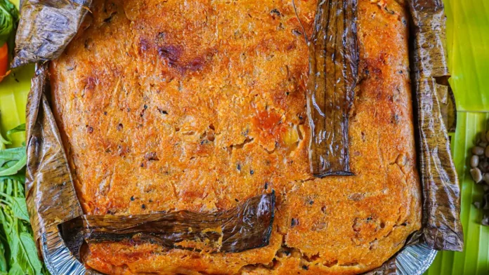 El mucbipollo no se parece a ningún otro tamal. Tiene una masa más espesa, un sabor ahumado y una textura que recuerda al pan firme y húmedo. En su interior guarda capas de carne, jitomate, cebolla morada y chile dulce, todo teñido por el achiote. Se envuelve con hojas de plátano pasadas por el fuego y se hornea durante horas. Al partirlo, se libera un aroma profundo, terroso y a la vez dulce: el perfume de la tierra cocida.